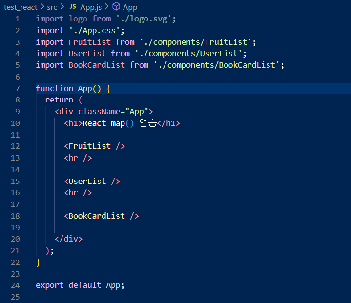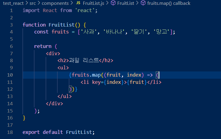 - JSX 안에서 fruits.map()으로 배열의 각 과일 이름을 <li> 태그로 변환해서 출력.
